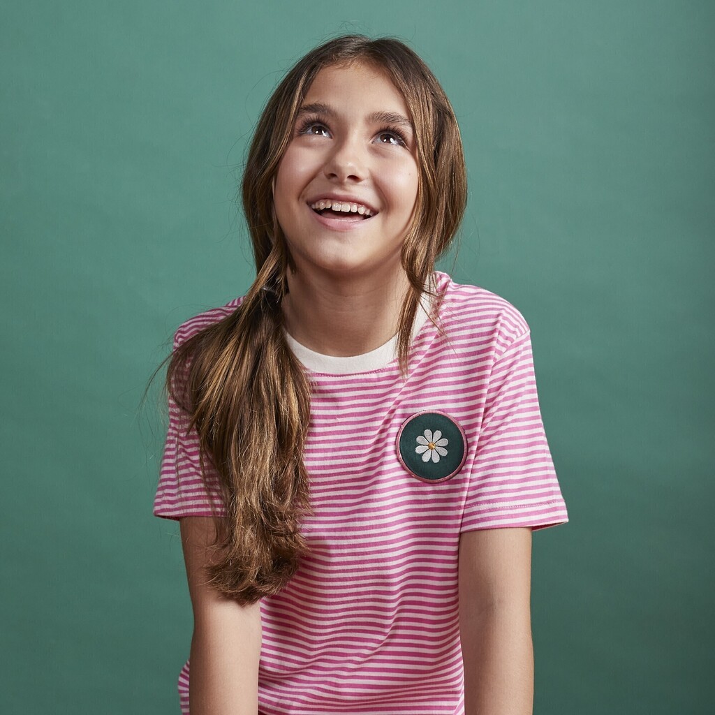 Descrição: Camiseta Square feita em algodão listrado branco e rosa. Detalhe na frente com patche verde com bordado de margarida.