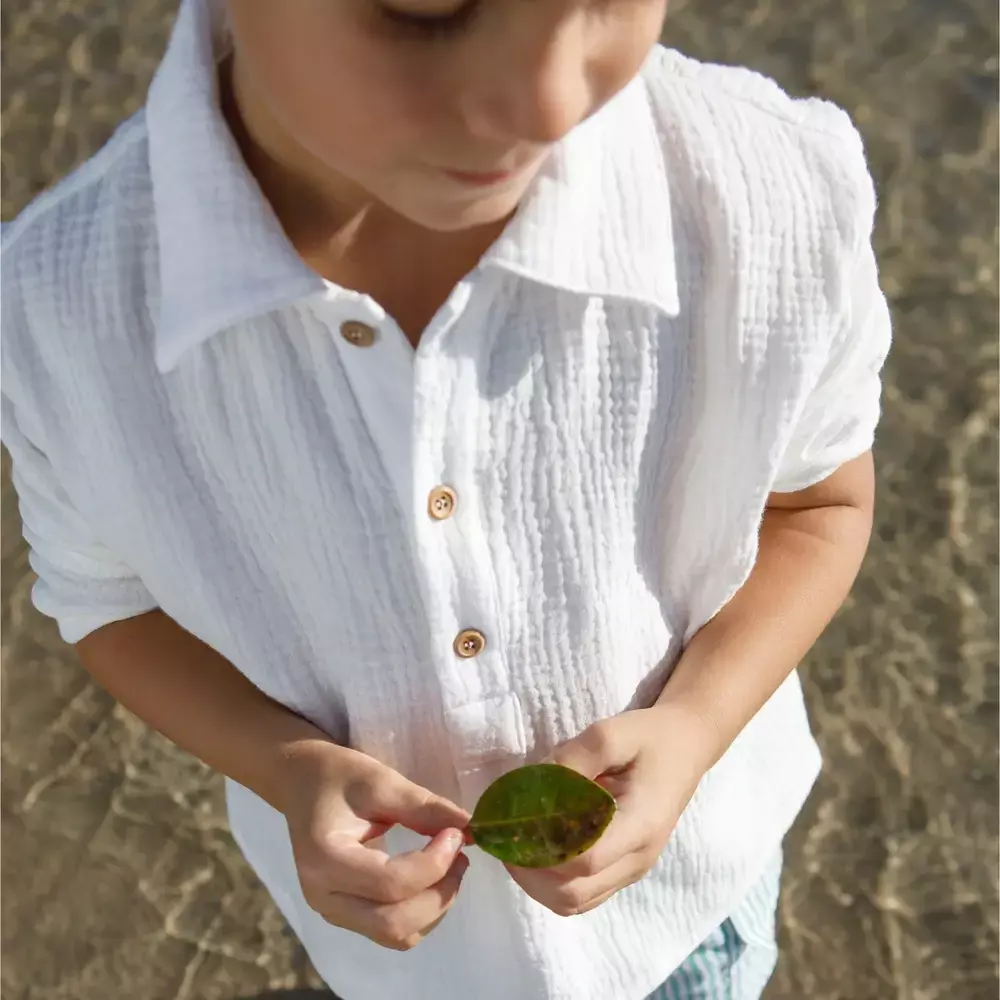 Descrição: Feita em gaze de algodão branca. Botões em madeira na frente e no punho da manga. Gola polo.