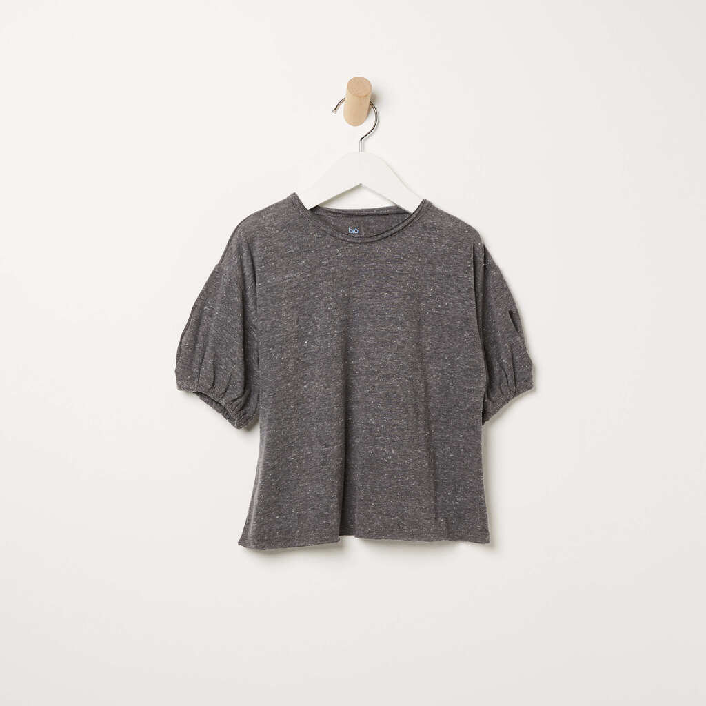 Descrição: Feita em algodão reciclado com manga bufante e detalhe com abertura.