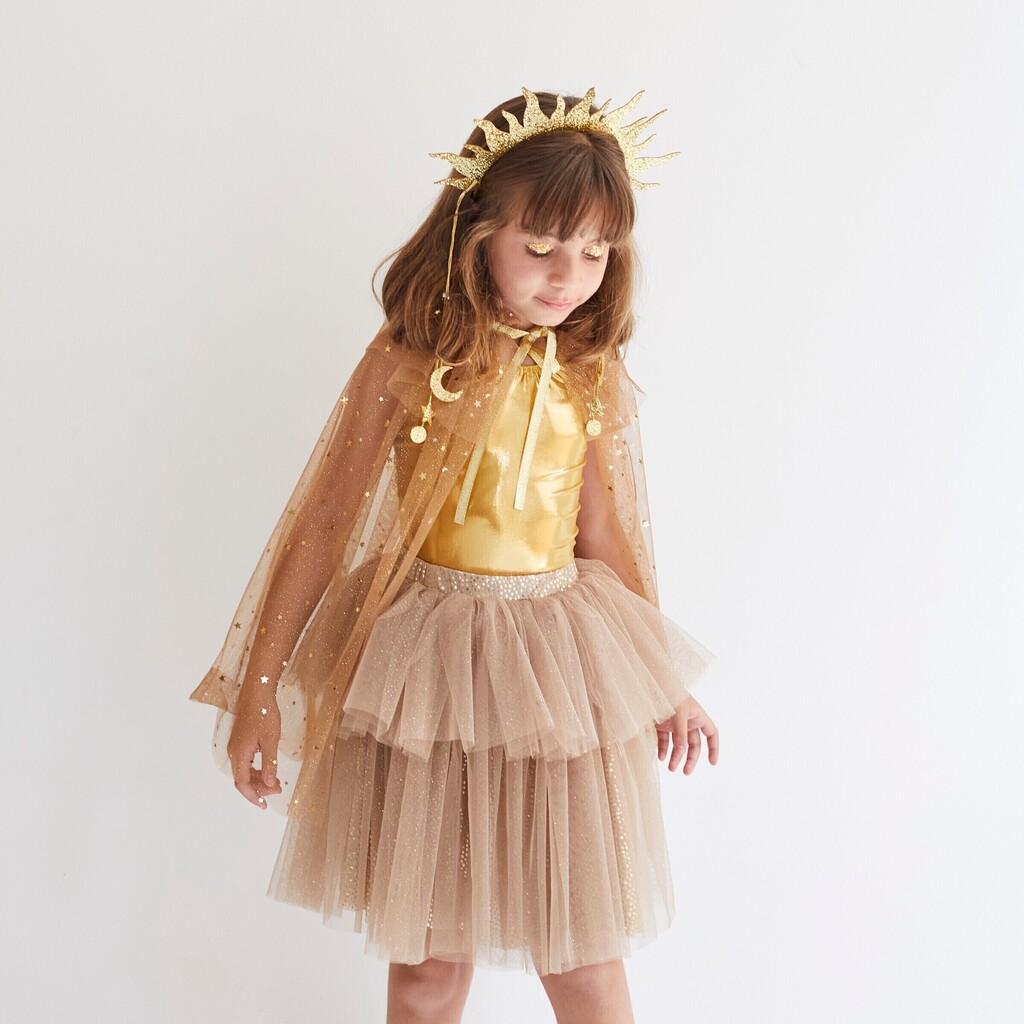 Capa dourada com tule de estrelinhas e amarração com fita dourada na frente.