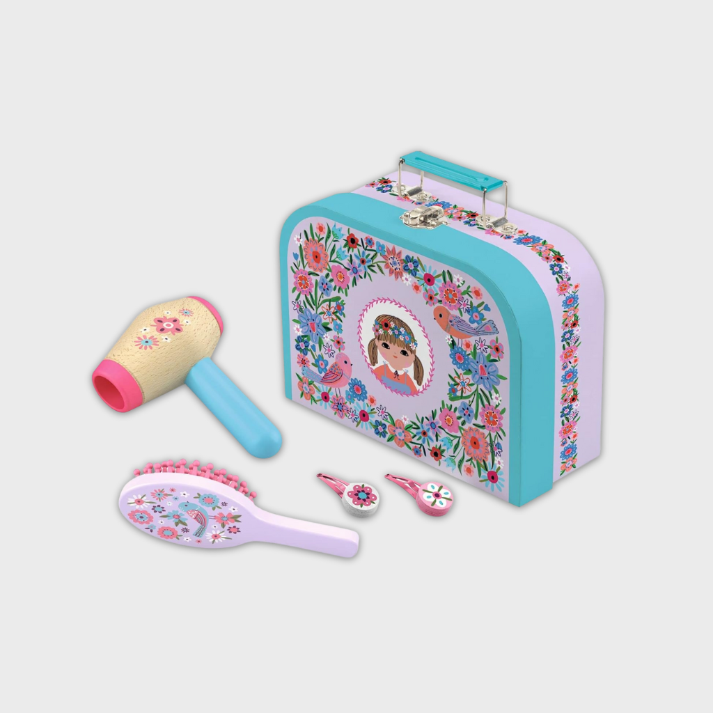 Descrição: Um lindo conjunto de cabeleireiro com muitos acessórios para o estilista iniciante, além de um cartão com algumas sugestões de penteados. Tudo vem em uma charmosa maleta de transporte que pode ser levada para qualquer lugar. Desenhado por Tara Lilly.