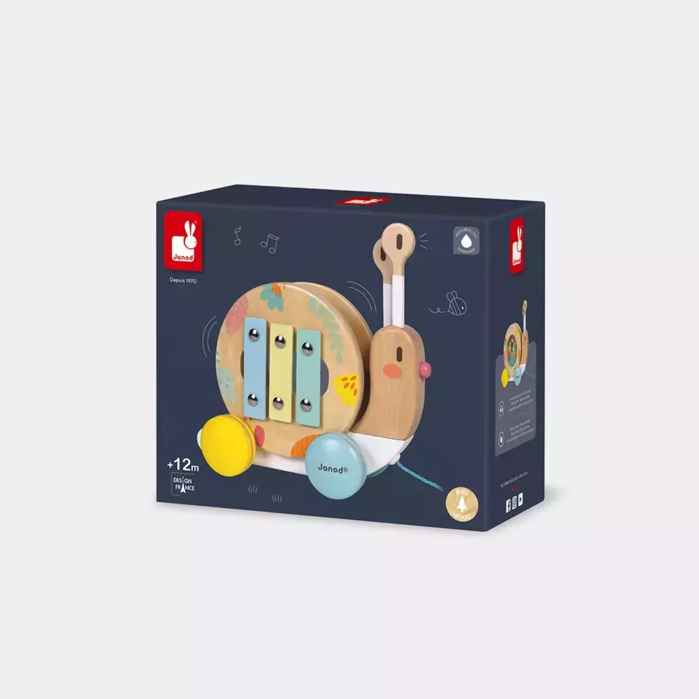 Caracol musical de madeira para passear, ideal para crianças a partir de 1 ano. Possui concha removível que revela um pandeiro e um xilofone, além de antenas que se transformam em bastões para bater nos instrumentos.