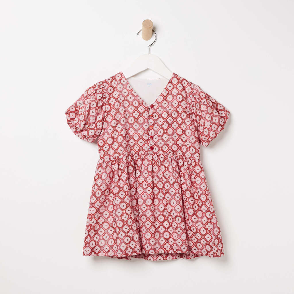Descrição: Feito em algodão em estampa exclusiva. Possui manga curta bufante com elástico soltinho. Botões na frente e saia rodada com forro.
